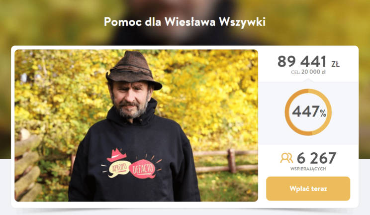 Ostatnimi czasy wielkim wydarzeniem w internecie było pozyskanie prawie 90 000 zł (!) na pomoc dla Pana Wiesława Wszywki, który zasłynął zabawnymi gagami w internecie. Problemy z biodrem, zębami i jak sam żartuje, wątrobą przy równoczesnym braku pieniędzy to niezbyt ciekawy plan na najbliższe lata. Mimo to internet pokazał swoją siłę: