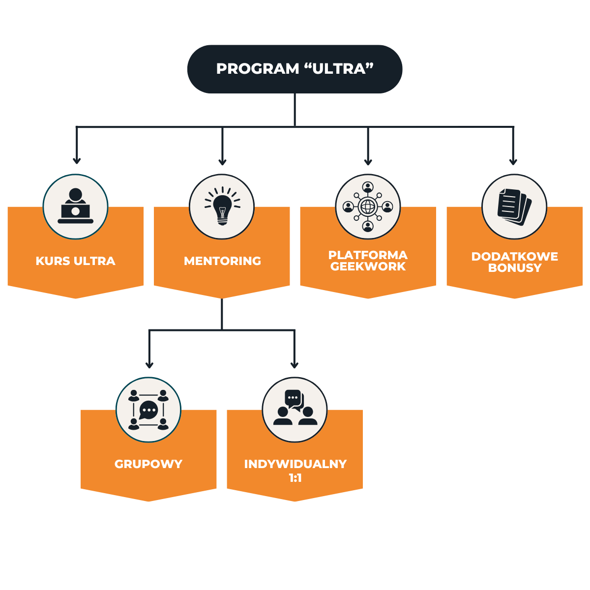 Program ULTRA to rozbudowany i praktyczny kurs połączony z mentoringiem 1:1. Strefa Geekwork to zamknięta platforma społecznościowa dla freelancerów.