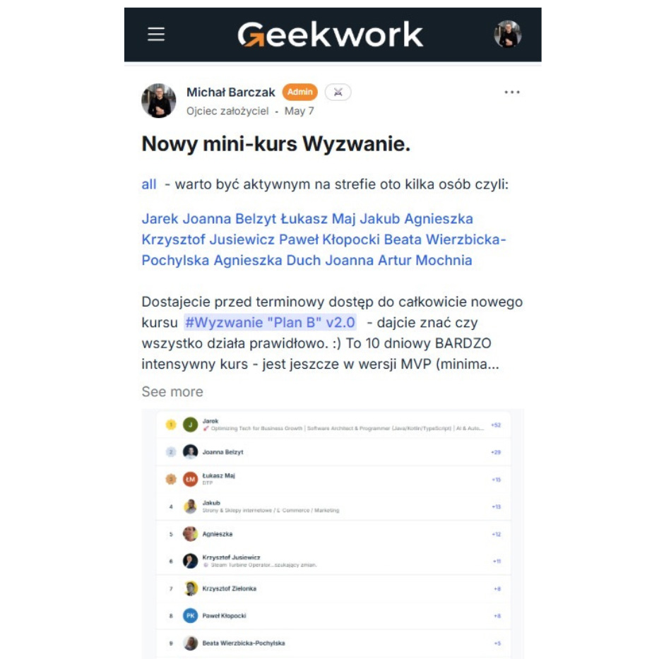 To ma być przyjemna przestrzeń dla ludzi o podobnym mindsecie. Dołączenie do społeczności nie gwarantuje, że będę odpowiadał na wszystkie pytania. Bywam tam regularnie, uczę i pomagam wraz z całym moim zespołem. Możesz zadać mi dowolne pytanie, na które postaram się odpowiedzieć.